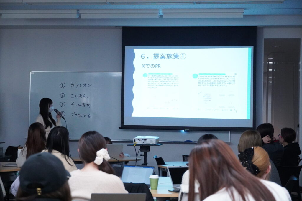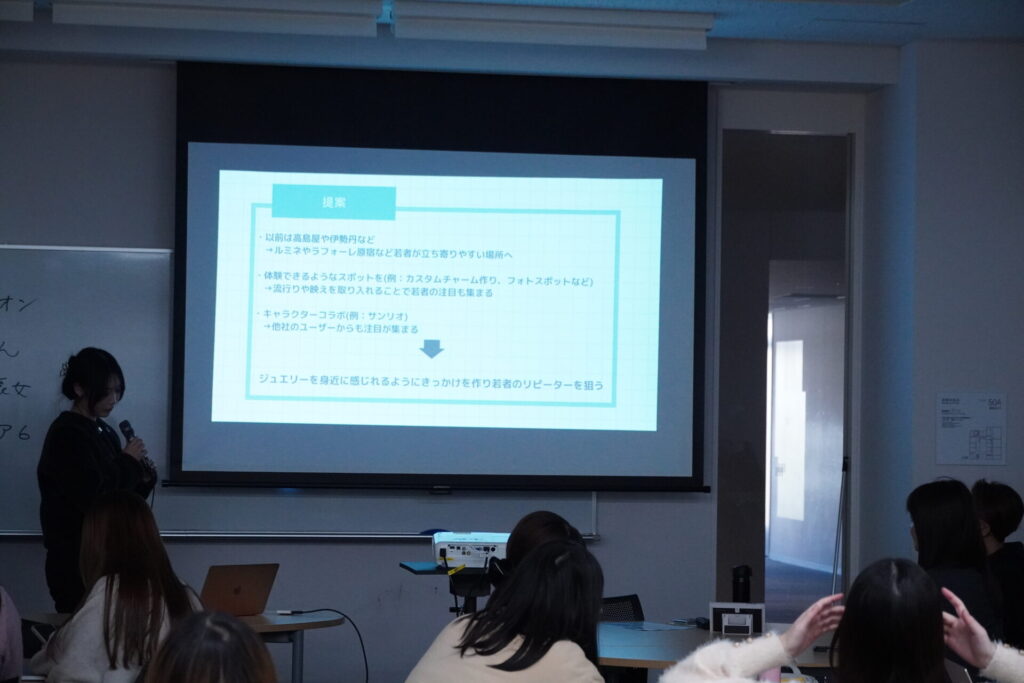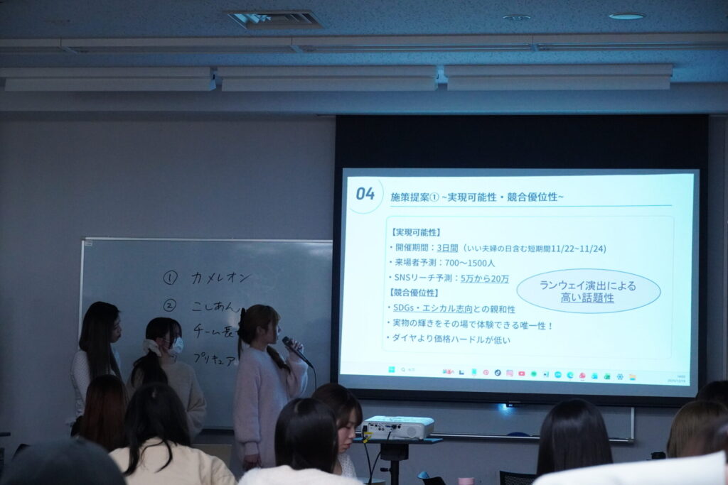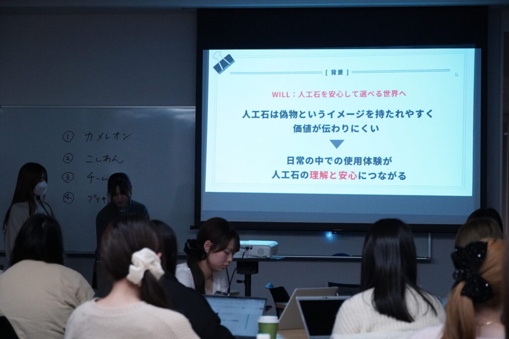 「実践デザインラボⅠ」(担当:人間社会学部社会デザイン学科 標葉 靖子教授)の授業で、12月19日に株式会社Brillar(ブリジャール)との特別コラボ授業が行われました。この日は1か月前に出された課題に対するプレゼンテーション。テーマは「人工石の指輪をひとつのライフスタイルや自己表現として広めるための具体的な施策を考える」です。学生たちはグループワークを経て発表に臨みました。