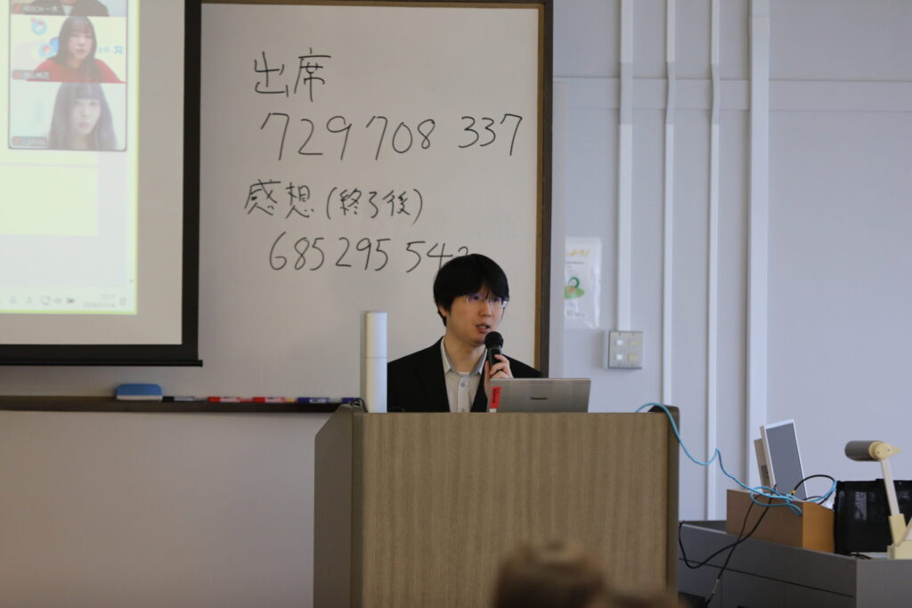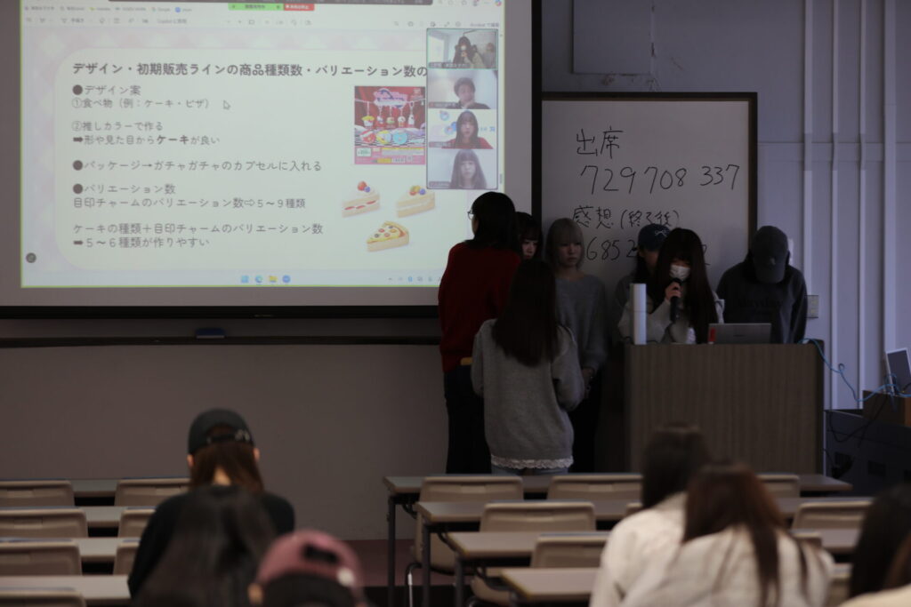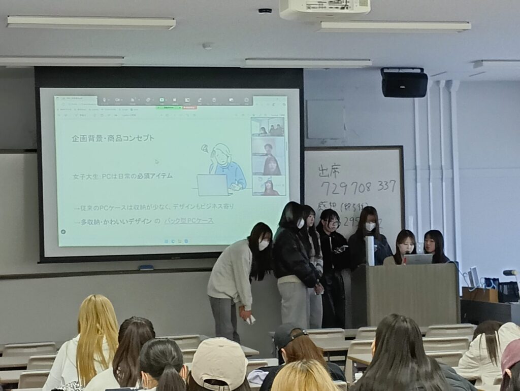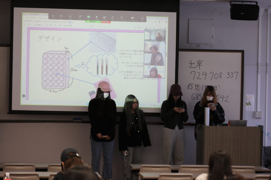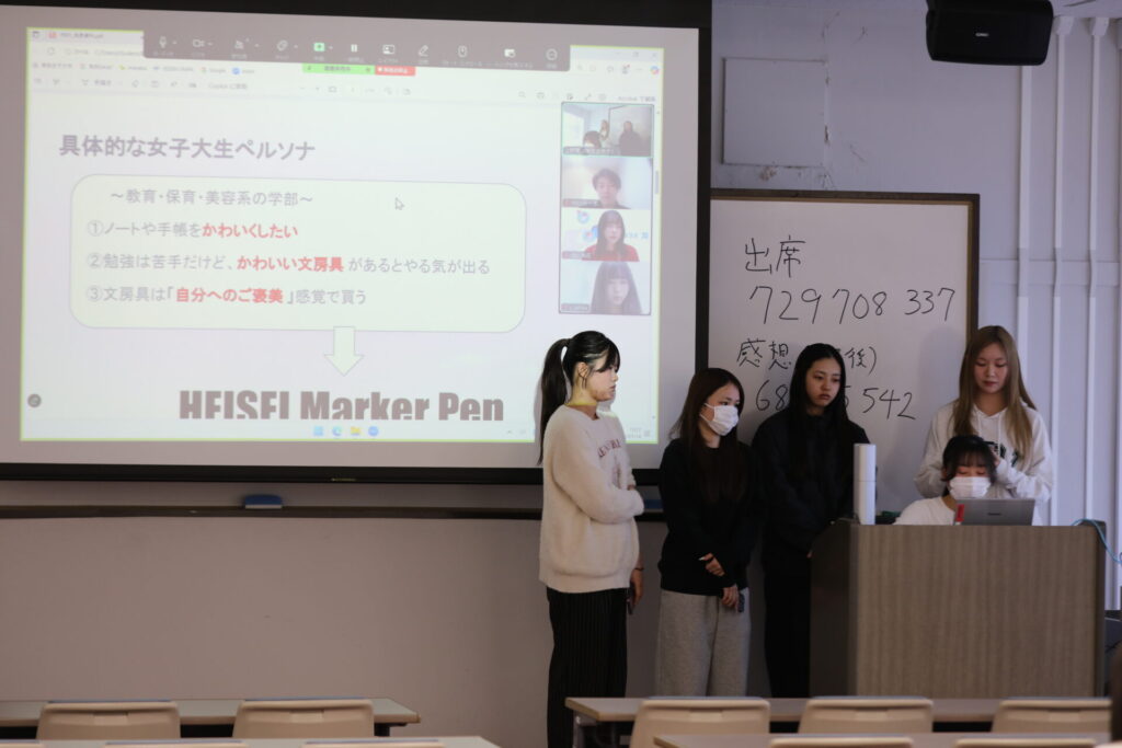 「ビジネスプランニング」(担当:現代生活学科 上野亮助教)の授業で、1月14日に株式会社REECH(以下、REECH)との特別コラボ企画が行われました。REECHはクロス・マーケティンググループの子会社で、インフルエンサーマーケティングなどを手がける広告企業です。この日は企業から提示された課題に対するプレゼンテーションを実施。テーマは「女子大生に好まれる文房具を考える」です。REECHの一木氏、石田氏、佐山氏、織田氏、池田氏、クロス・マーケティングの日下部氏もリモートで参加し、学生たちの発表を見守りました。