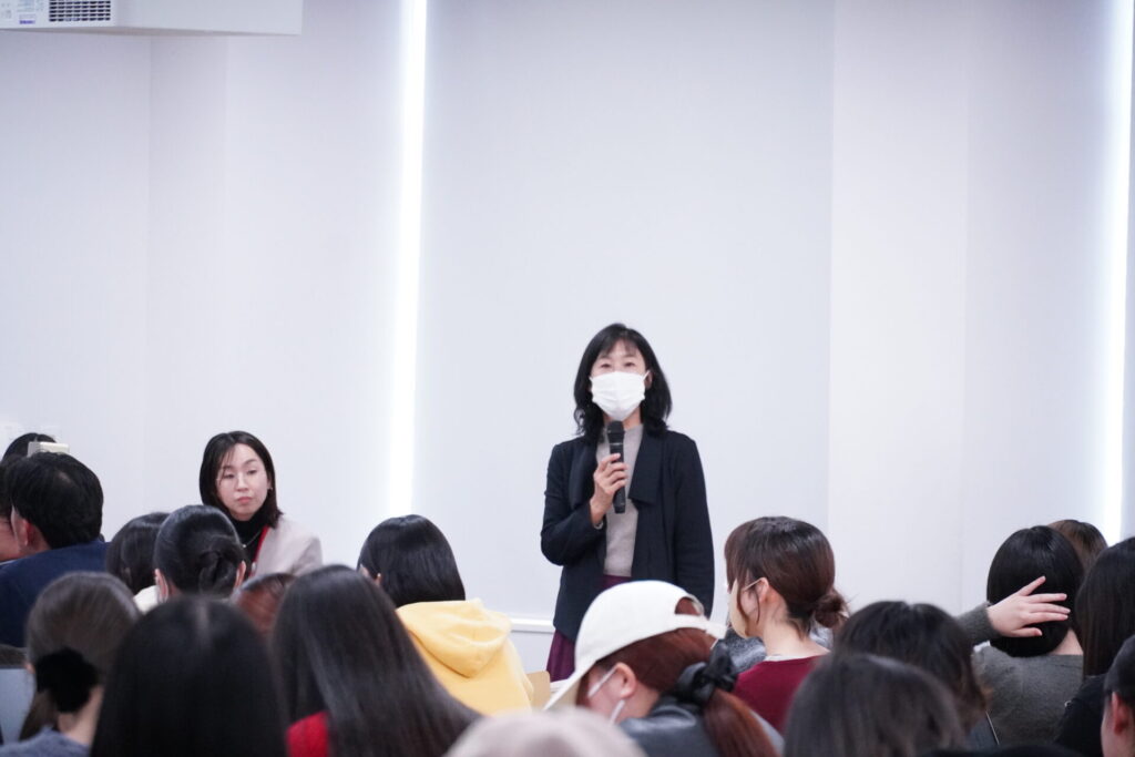 さらに、女性営業職の成長支援の活動として、〈BLOOM〉が紹介されました。〈BLOOM〉は、営業職として働く女性が勤務地を超えて集い、交流会や研修を通じてスキルアップと横のつながりを深める取り組みです。大植氏は「〈BLOOM〉には全国の女性営業職30人弱が所属しています。女性の営業職は、営業職全体人数の10%ほどですが、片手で数えることができた過去から比較すると急増しているんです。」と話しました。社内で女性が活躍できる環境が整えられた結果、実際に仕事で力を発揮する女性が増えてきていることが紹介されました。