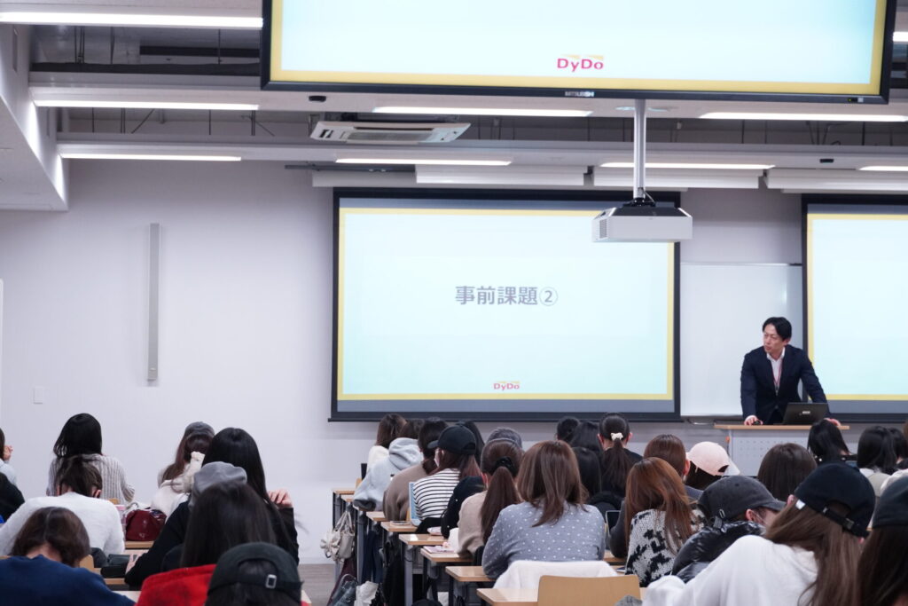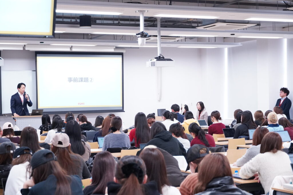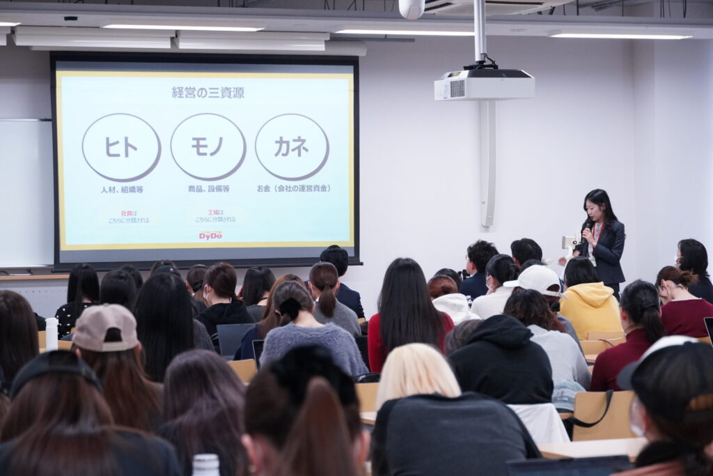 今回の授業ではダイドードリンコから大植あかね氏、奥川美優氏にご登壇いただき、「働く女性の本音〜理想の働き方と福利厚生を知る〜」というタイトルで、ダイドードリンコの経営、制度、女性活躍についてご講演をいただきました。また、講義の後半には事前学習として学生が取り組んだ課題「こんな自販機があったら」の内容共有と、ゲストからのフィードバックが行われました。