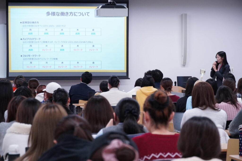 また、週4回までテレワークが可能であることが紹介され、会社の制度が一人ひとりの意思や状況に寄り添った働き方を支えていることが伝えられました。