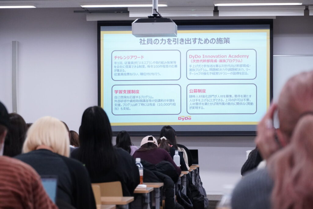 このD休暇は、社員が年に一度、ビジネスプランや施策を提案できる〈チャレンジアワード〉を通じて生まれた制度であること、奥川氏自身が人事総務部の同僚とともに企画・提案を行い、実際に制度として採用されたと紹介がありました。社員の声が制度として形になる社内風土から、人材への意識の高さが感じられ、学生たちは、制度を「使うもの」として捉えるだけでなく、働く人の声によってつくられていくものとして考える視点を得ました。