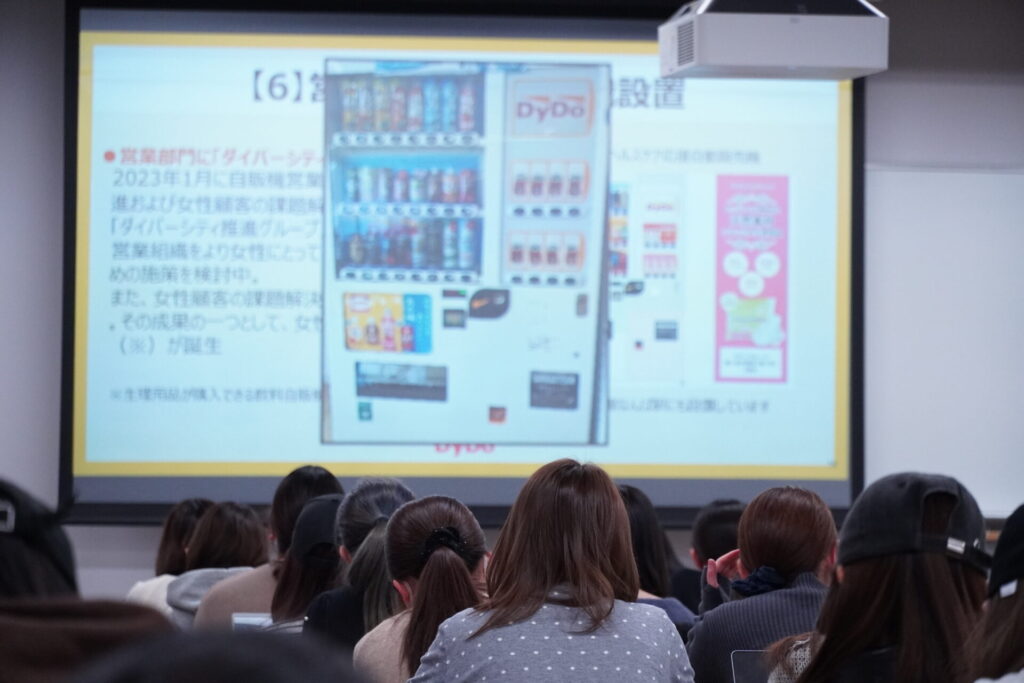 また、組織的な意識改革として、社内に〈ダイバーシティ推進グループ〉が設置されていることが紹介されました。専門家を招いてSDGsやダイバーシティに関する研修を行う他、グループの働きの一つに「女性にとって働きやすい環境づくりがある」と話し、グループから企画として提案された『女性ヘルスケア応援自販機』を紹介しました。大植氏は「『女性ヘルスケア応援自販機』は、飲料と共に生理用品も販売する自販機です」と概要を紹介し、本学渋谷キャンパス9Fにも設置されていることを話しました。事業を通じて多様性を包み込む姿勢が表れていることが語られました。