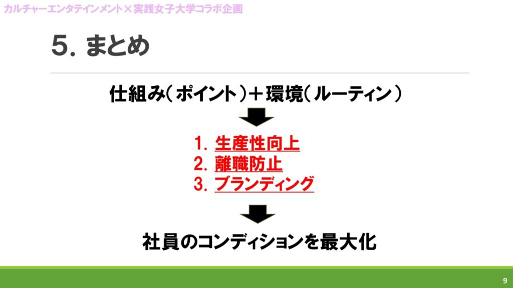 最後に「仕組(ポイント)」と「環境(ルーティン)」を掛け合わせることで、社員のコンディションを最大化させ、エンタメ業界における新しい福利厚生の形を構築し、社員と会社が共に成長できる未来を築きましょうと締めくくられました。