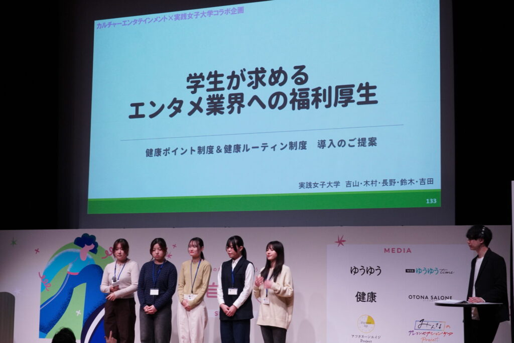 「ご自愛市(ごじあいいち)」とは、出版社である主婦の友社が主催する、新しい自分に出会うための一歩を踏み出せるきっかけを提供している、ウェルネスイベントです。今回は、「すごい!健康長寿力アワード2025」授賞式と同じ時間内にて、カルチュア・エンタテインメント グループ株式会社への「学生が求めるエンタメ業界への福利厚生」をテーマとしたプレゼンテーションを実施しました。