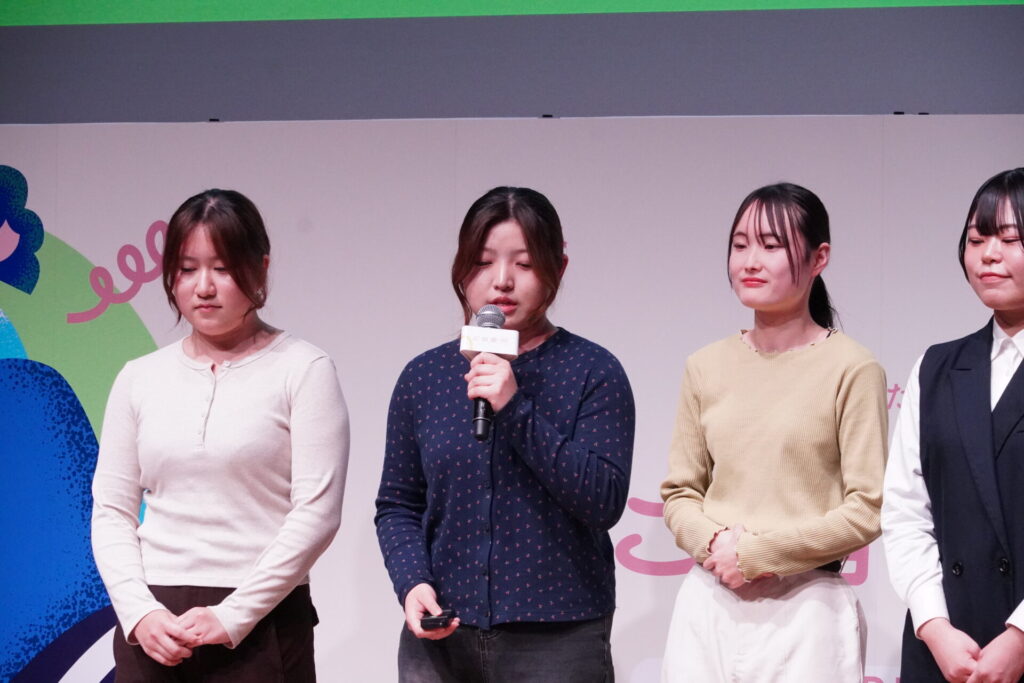 これまでのJWPの活動にたくさん参加してきましたが、企業さんに提案するタイプはあまりなく、本プロジェクトにて新しい挑戦ができて楽しかったです。主婦の友社さん、カルチュア・エンタテインメント グループ社が「学生らしさ」を大事にしてほしいと私たちの企画を後押ししてくださり、企画の内容に自信が持てました。「ご自愛市」での発表も緊張しましたが、等身大の私たちを伝えられた良い発表ができたと思います。(英文学科4年吉山)