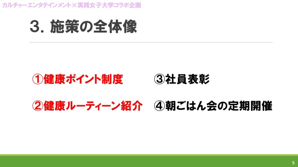 2点目は健康ルーティーン紹介制の導入です。当番制で従業員は、自身が行っている健康習慣や日頃の行いなどを動画等で紹介していきます。若手から管理職まで幅広い世代が繋がることで、社内の交流と自身の健康を見直すきっかけをつくることが狙いで、社員同士の交流が継続されるように「朝ごはん会」や「社内表彰」も併せて実施します。
