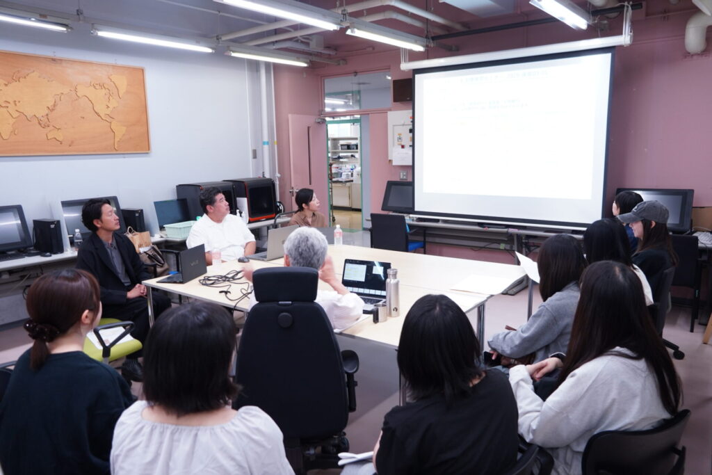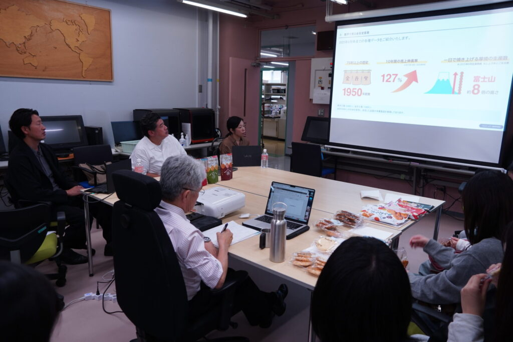 10月9日(木)生活環境学セミナー(担当:環境デザイン学科 安齋 利典教授)にて、株式会社金吾堂製菓(以下金吾堂)から常務取締役 碓田憲司氏、商品企画室 小谷真理子氏、株式会社ロッケン(以下ロッケン)から小笠原真一氏をお招きし、コラボプロジェクトが行われました。