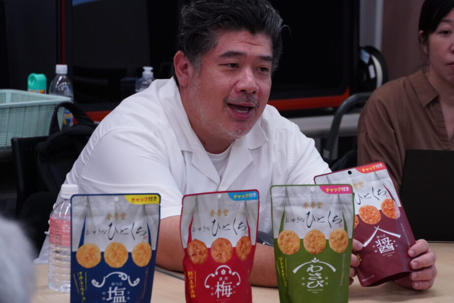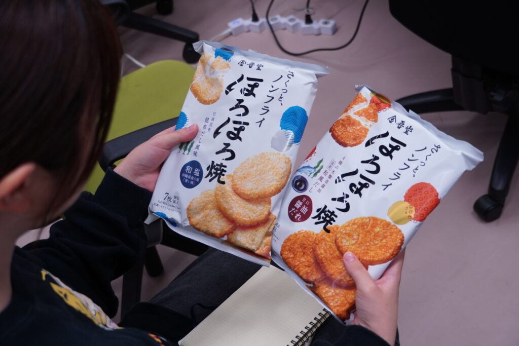 学生が食べているせんべいのパッケージに関する質問では「音のなるパッケージが好みではなく、その時点で選択肢から外れる」「持ち運びにはチャック付きが便利でありがたい」「ながら食べをするので、せんべい自体が一口サイズなのはいい」と学生から素直な感想が寄せられました。
