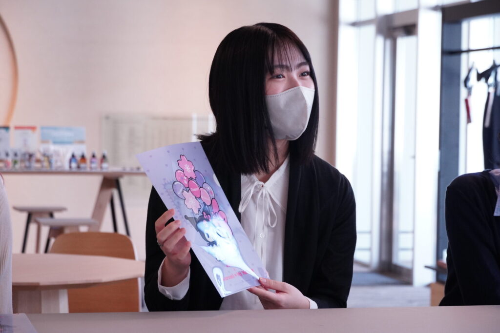 石河さん「もともとコラボをしたキャラクターが大好きで、昨年深澤先生の授業を受けたときにも『この企業さんとコラボしてください!』とお願いしていました。春休みに『コラボプロジェクトを行うからぜひ参加してほしい』と声をかけていただき、参加を決めました。」
