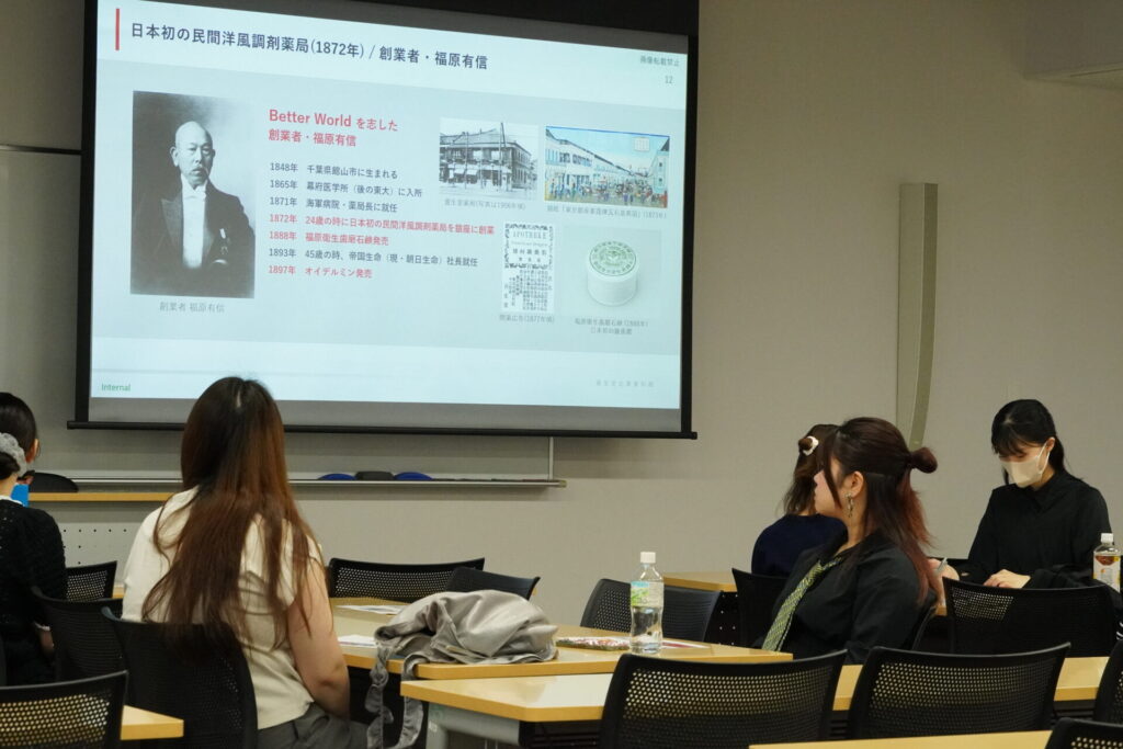 まずは、資生堂企業資料館の大畑館長からの講話をいただきました。150年を超える長い歴史を持つ資生堂、常に時代の先導者として、「美」へのこだわりを繋ぎ続けてきた社員たちの深い思いがあります。