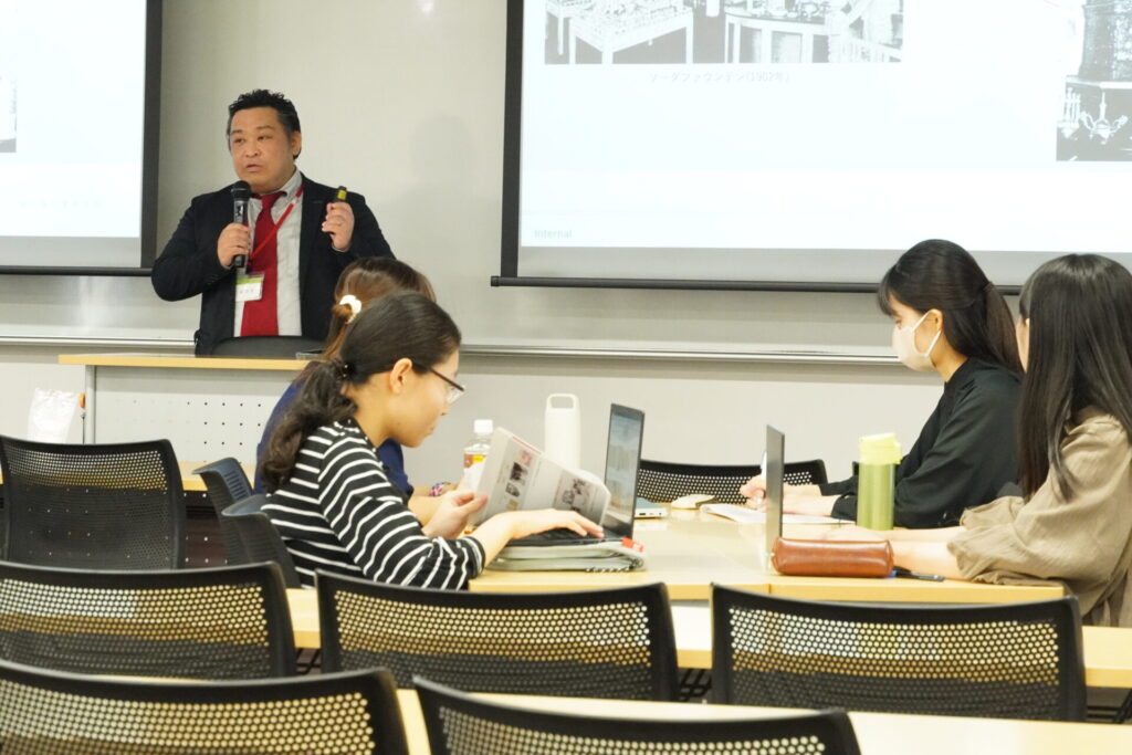 10月2日(月)に国文学マーケティングプロジェクト(担当:文学部国文学科 深澤晶久教授)にて、株式会社資生堂(以下資生堂)資生堂企業資料館館長の大畑昌弘氏をお招きし、企業の歴史と理念についてご講演をいただきました。国文学マーケティングプロジェクトは、文学部国文学科を対象に開講されている専門教育科目です。日本文学とかかわりの深い企業を主体的に調査研究することで、マーケティングと文学の関連性を意識し、学科で学ぶ意義をより深めていくことを目的としています。