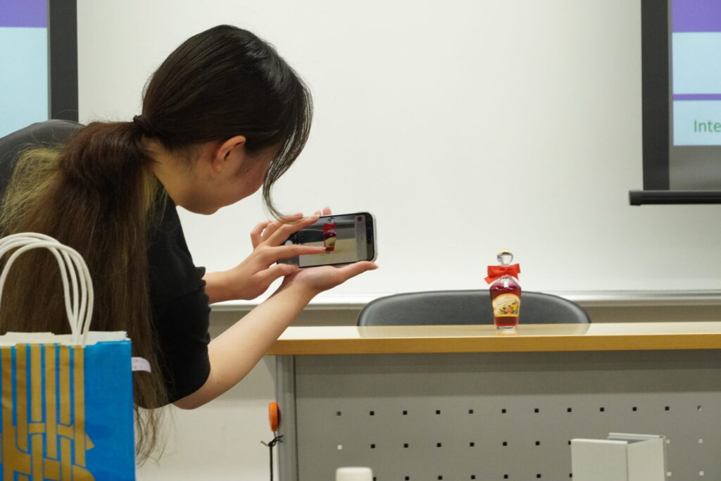 講演の最後には、資料館から持参された貴重な品々を間近で鑑賞する時間が設けられました。会場では、大畑氏の解説を受けながら、1897年に販売が始まった化粧水「オイデルミン」のレプリカや、シーンに合わせたメイク方法を紹介する「ビューティーチャート」などが紹介されました。なかでも注目を集めたのは、日本で初めて女性ホルモンを配合したクリーム「ホルモリン」です。容器には、繊細な装飾と資生堂の花椿のロゴが施されており、大畑氏は学生に「率直な感想を聞きたい」と問いかけました。学生からは「小さくてかわいい」「ロゴのワンポイントが素敵」などの声があがり、大畑氏は「今の感覚を知りたかったのですが、やはり“かわいい”と感じてもらえるのですね」と満足そうに話しました。