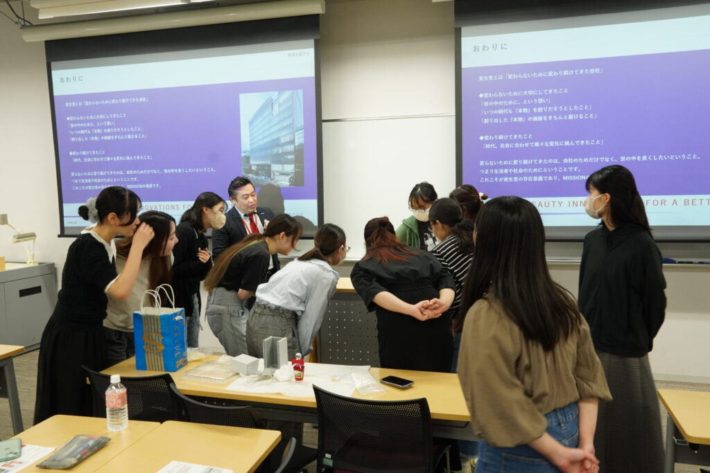 学生から「働いている人の男女比率はどのくらいですか?」という質問が出ると、大畑氏は「美容部員を含めると女性が8割。含めなくても5:5か4:6くらいで女性が多いと思います」と回答。学生たちは、その割合が予想以上だったのか、驚いた様子を見せていた。