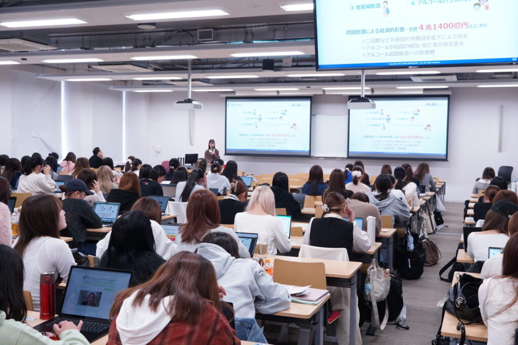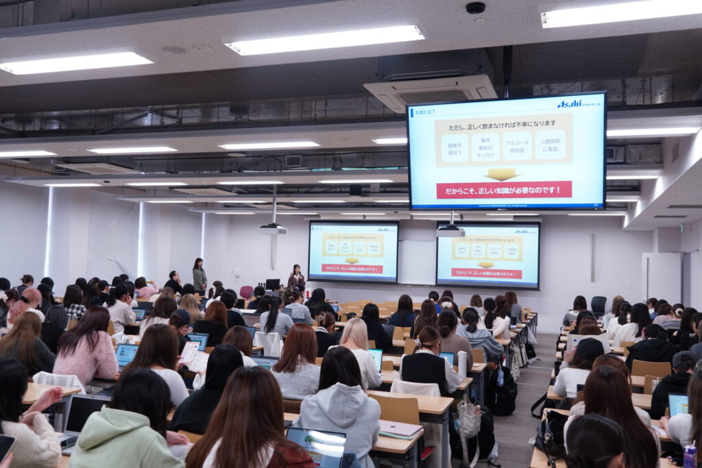 このほかにも、飲酒によって引き起こされる健康被害や、不適切な飲酒によるさまざまなリスクについて解説があり、学生たちは適切にお酒を楽しむための正しい知識を学びました。