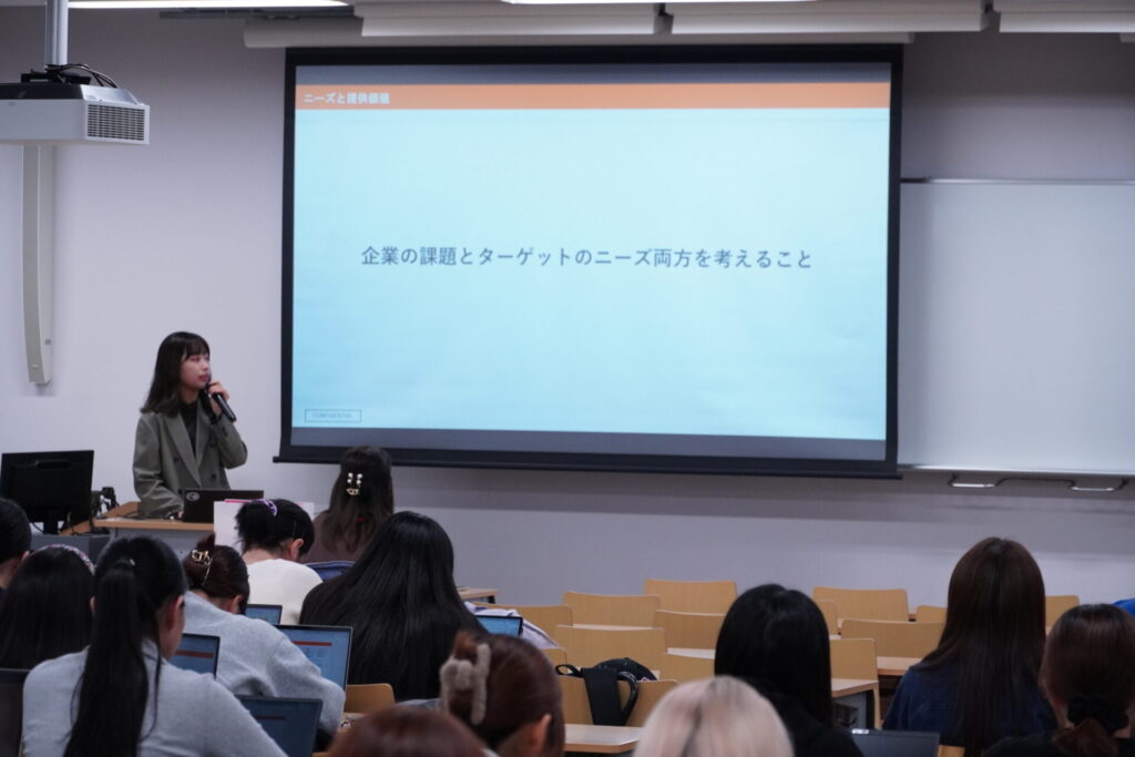 続いて、マーケティングのアイデアを具体的な施策へと落とし込む際のポイントを紹介。過去の事例をもとに、フレームワークの活用方法や施策立案の流れをわかりやすく解説し、学生たちは真剣な表情で耳を傾けていました。