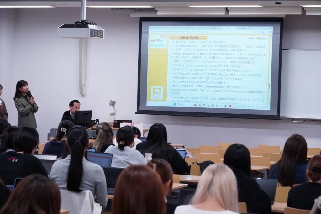 本学では「スマートドリンキング」に関するプロジェクトをテーマに、原田教授のゼミや講演などを通して3年間にわたりスマドリ社との連携を行っています。今回のコラボレーションでは、スマドリ社が提案するライフスタイルや飲酒に対する意識の変化についての講義に加え、マーケティングに関する解説やミニワークも実施されました。学生にとって、社会の動向を学び、自らの専門領域への理解をさらに深める貴重な機会となりました。