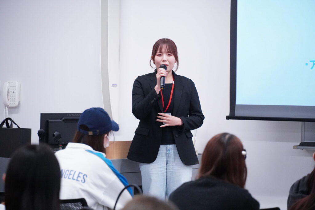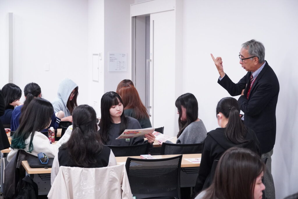 当日はゲストとして、元アンファー株式会社常務取締役、株式会社ディーメディカルジャパン(アンファーの系列企業)相談役の中溝幸生氏と、アンファーグループグループ経営統括局 人事部の堀川瑞希氏が登壇しました。講演に先立ち、堀川氏は「学生の皆さんが将来の就職活動の際に、アンファーグループを選択肢の一つとして考えてもらえたら嬉しい。また、今日の課題にはぜひ一生懸命取り組んでほしい」とエールを送りました。