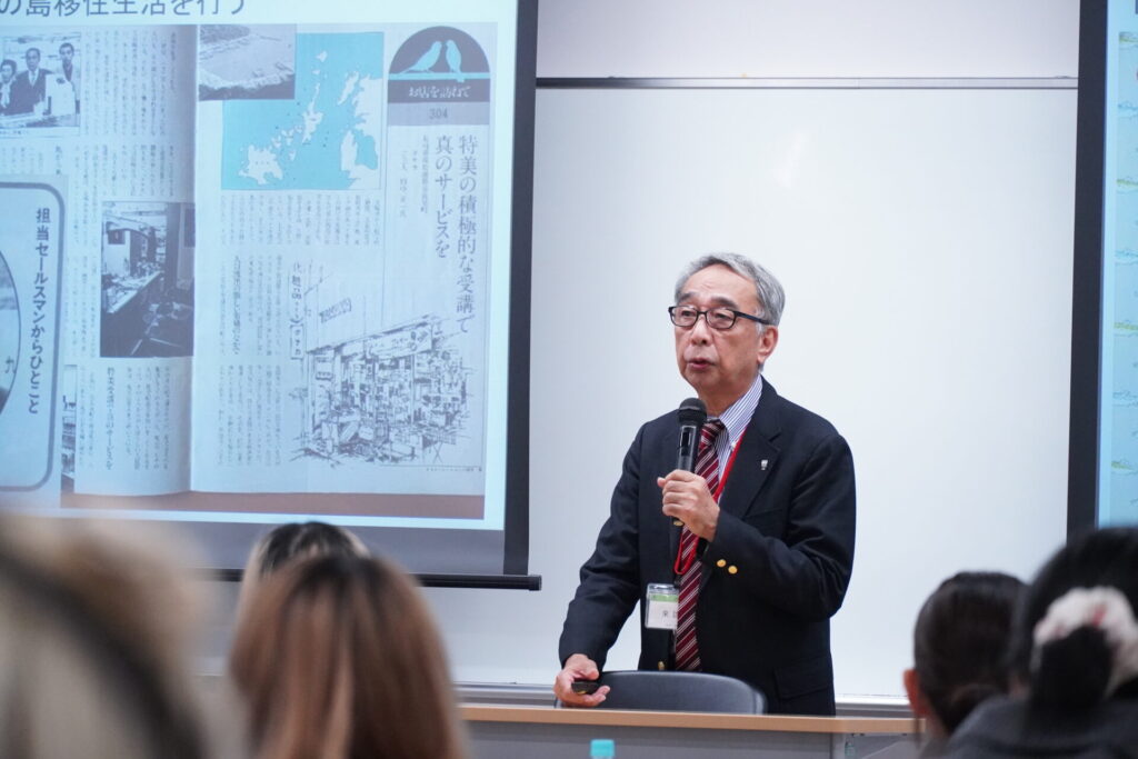 今回ご講演いただいたのは、中溝幸生氏です。中溝氏は元資生堂勤務で、深澤教授からは「私の先輩で、一緒に働いていました。机が隣だった時期もあるんですよ」との紹介がありました。
