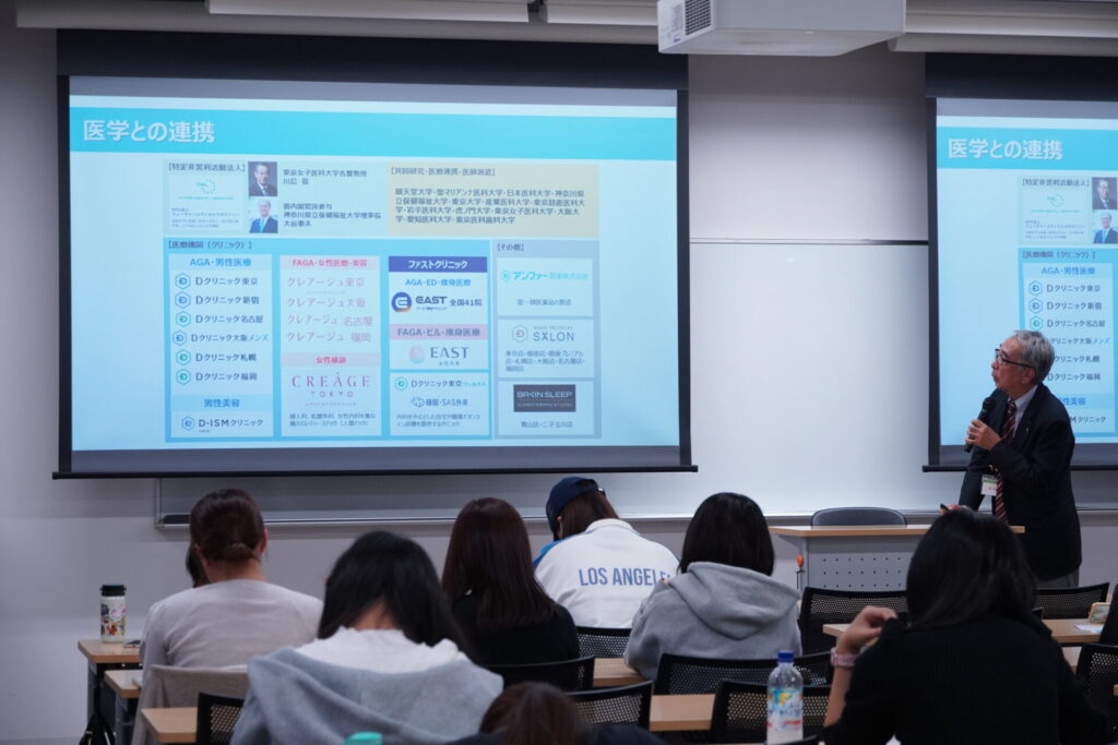 また、アンファーグループ内の企業構成についても詳しく説明があり、「皆さんがドラッグストアで目にする〈スカルプD〉や<まつげ美容液>の販売を行う企業と、クリニック事業の両輪で活動しています。」と紹介。「お客さんの悩みの深さに対応して、日常的の使う商品提供や治療を行う自由診療クリニックを運営し、すべてのお客様に満足いただける企業を目指しています」と述べました。