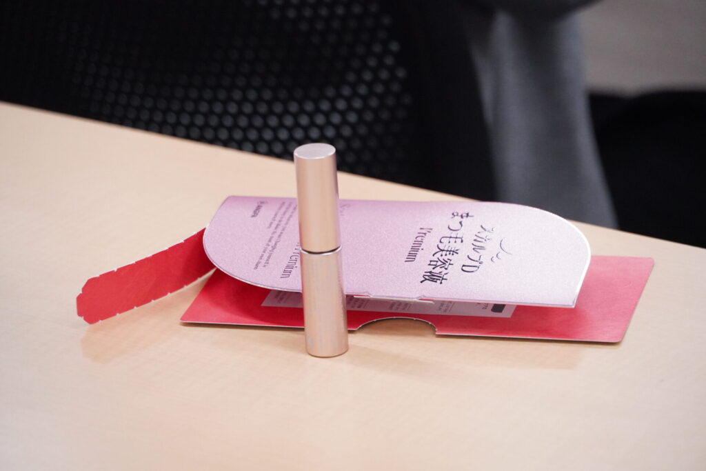 今回、学生が取り組む課題は「〈スカルプDまつ毛美容液〉のリピート対策の提案」です。中溝氏はシリーズの中でも〈スカルプDまつ毛美容液プレミアム〉を取り上げ、全15班に商品のサンプルを配布しました。