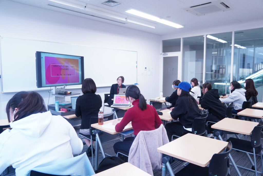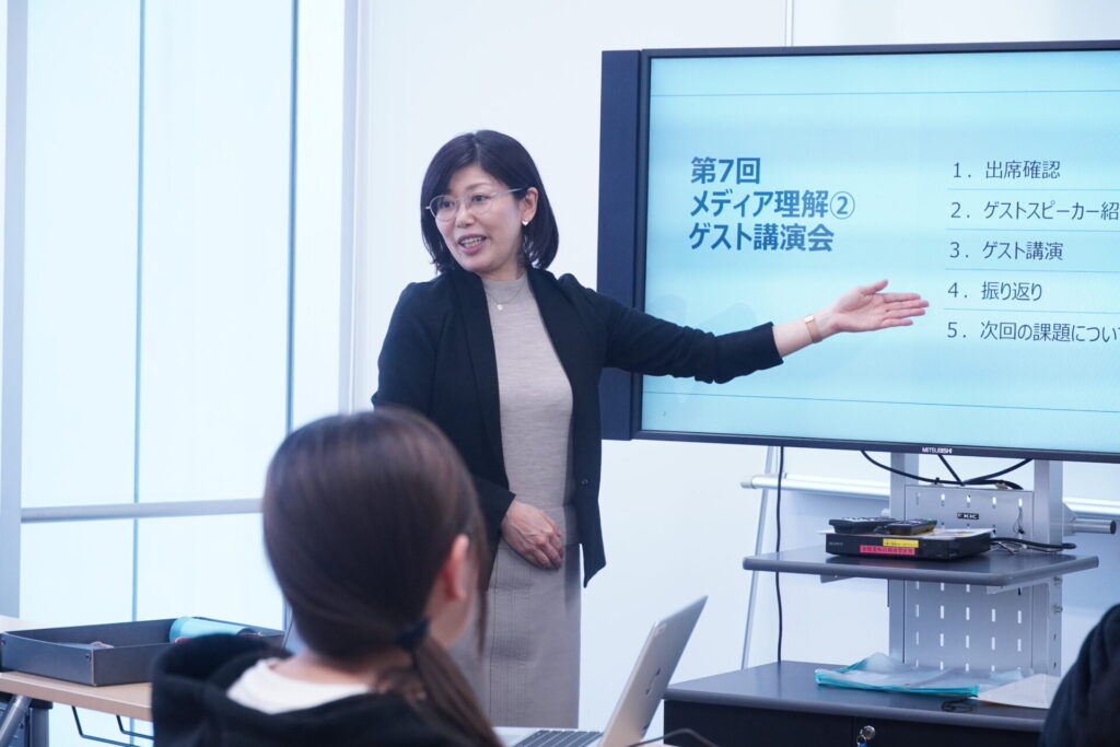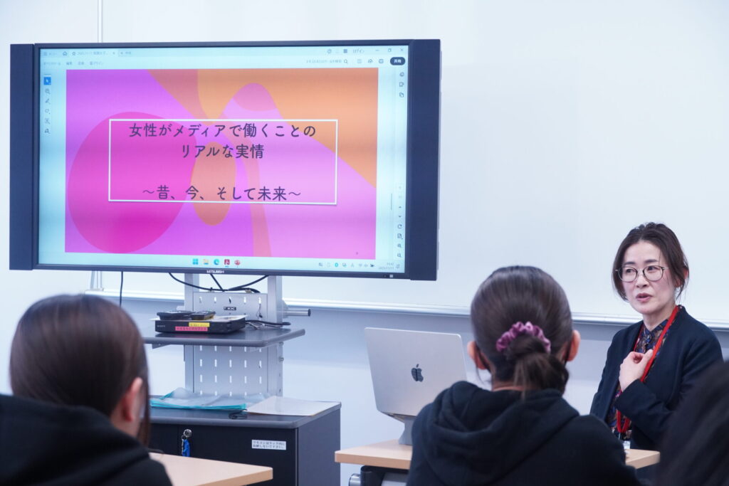 今回の授業では、特別講演として放送作家の高山佑子氏が登壇。「メディアを仕事にする女性」としての経験を中心に、放送作家の業務についての説明と家庭と仕事の両立についてご講演いただきました。