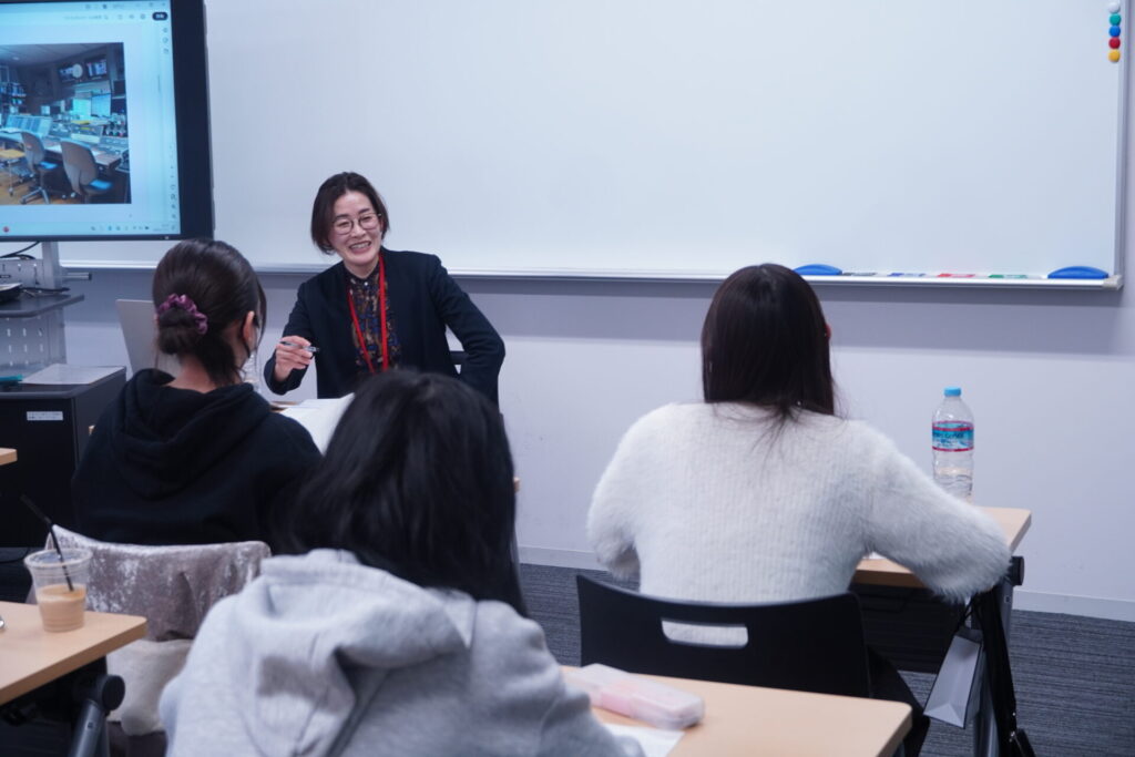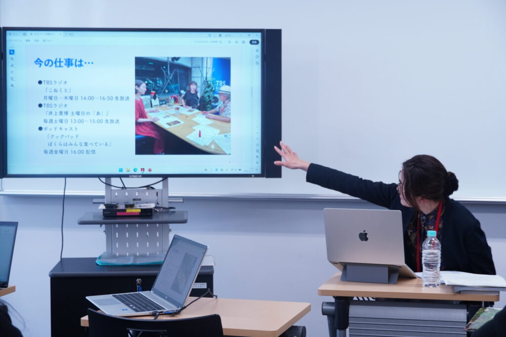 2025年11月11日(火)キャリア・オープン講座(担当:文学部英文学科 鹿島千穂専任講師)にて、放送作家の高山佑子氏をお招きし、メディアを仕事にする女性から見た「リアルな音声メディア業界」についてご講演いただきました。