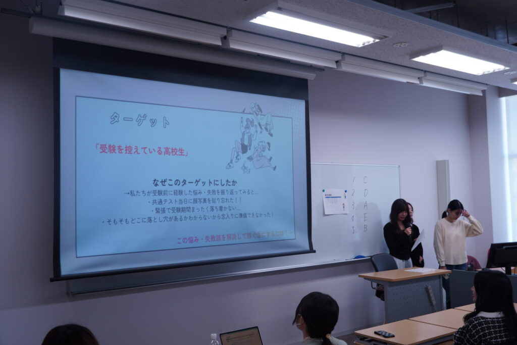 まなび日和は、実践女子大学の「上品さと温かさ」を受験生に伝えることや、自分も入学して企画に挑戦したいと思えるきっかけを作ることをテーマにしました。調査結果から、高校3年生の約8割が勉強法に不安を持ち、推薦入試などでは面接など勉強以外の対策の悩みも大きいことを紹介。「これらの不安感に寄り添うアイテムを提供したい」と述べました。