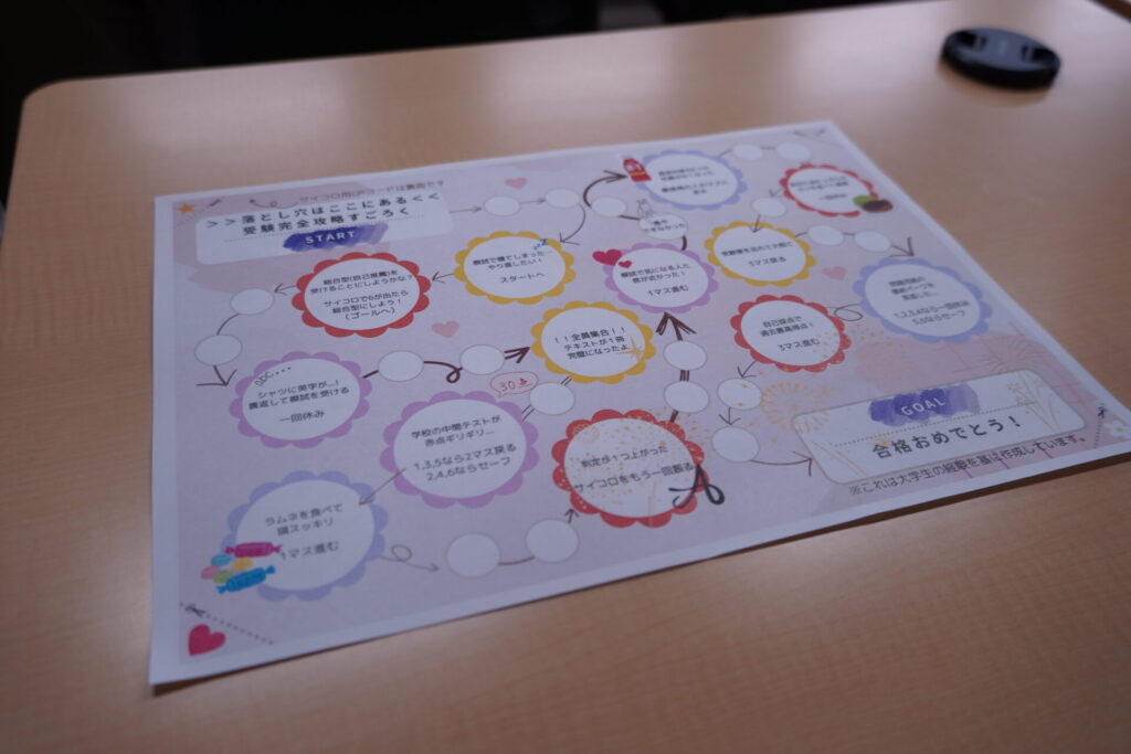 缶の中身は〈受験完全攻略すごろく〉と、〈香り付きの練り消し〉です。 すごろくは、学生の体験談に基づき、起こりうる勉強以外の失敗例を知ることで、その予防と心づもりを促します。紙の切り取りでコマが作れる点や、さいころサイトのQRコード記載など、缶の内容だけで遊べる工夫も凝らしました。裏面には「深呼吸」「ツボを押す」といった具体的なリラックス行動が記載され、緊張対策を伝えます。 練り消しは、香りや懐かしさによるリラックス効果に加え、練るときの指先の反復動作による落ち着き効果を狙いました。
