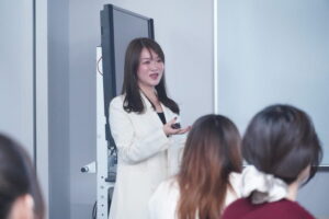 「実践デザインラボⅠ」(担当:人間社会学部社会デザイン学科 標葉 靖子教授)の授業では、11月14日より株式会社Brillar(ブリジャール)との特別コラボ授業がはじまりました。ダイヤモンドに負けない輝きを誇る人工石を使ったジュエリーブランドで、小原亦聡氏がゼロから立ち上げた現在も成長を続けている企業です。女性一人が手探りで立ち上げた新しいジュエリーの可能性に、学生たちも強い関心を寄せ、真剣に耳を傾けていました。